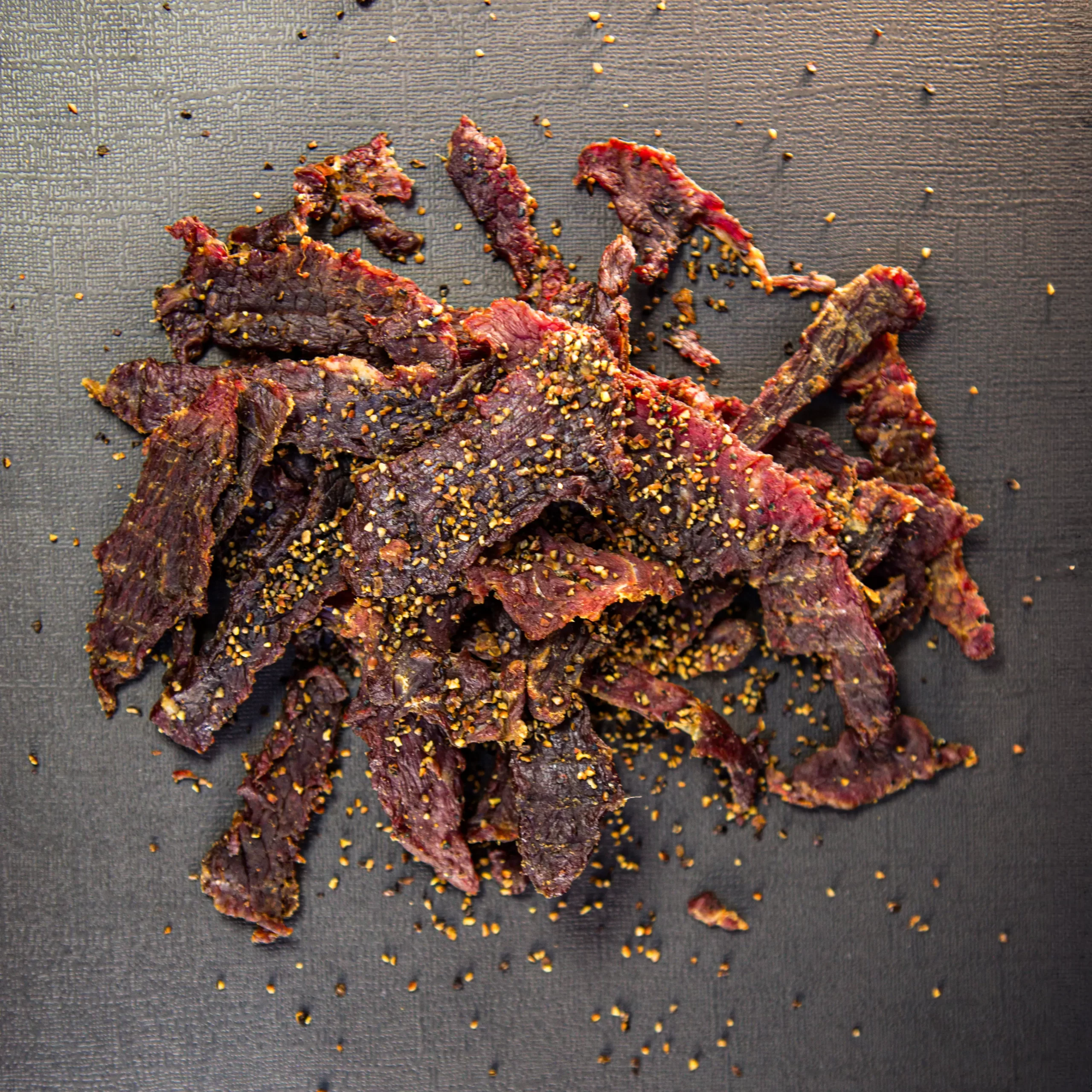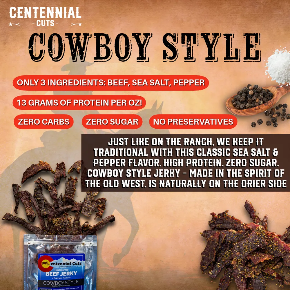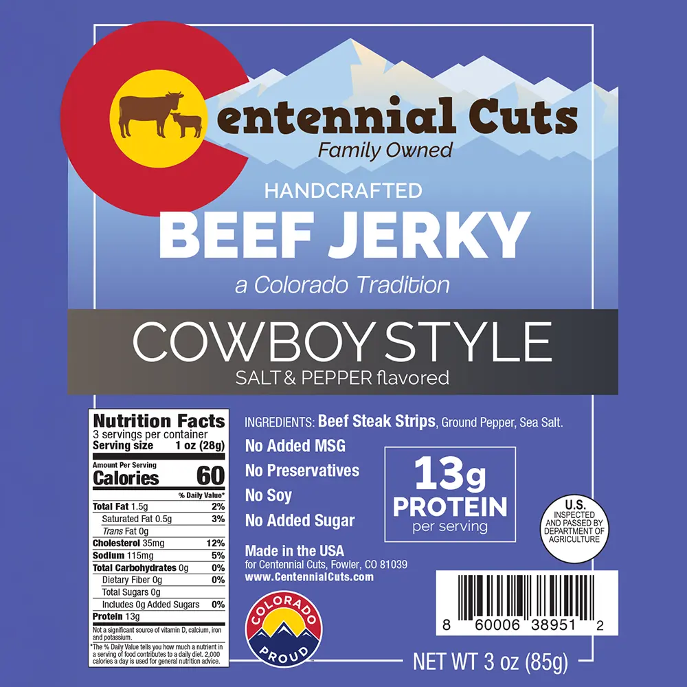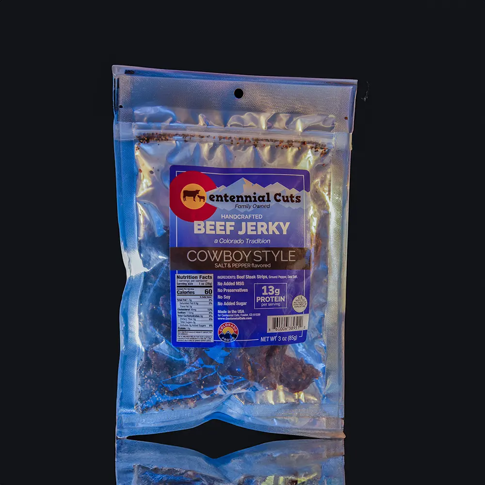 Cowboy Style is definitely our highest seller, so don’t miss out! There are only 3 ingredients: Beef, Salt, and Pepper. There’s also 13 grams of protein per ounce and NO PRESERVATIVES! Just like on the ranch, we like to keep it traditional with this flavor. This jerky is on the dryer side, and has a classic black pepper flavor! Our jerky is the perfect protein-packed snack! All our beef is sustainably raised and harvested in Colorado.