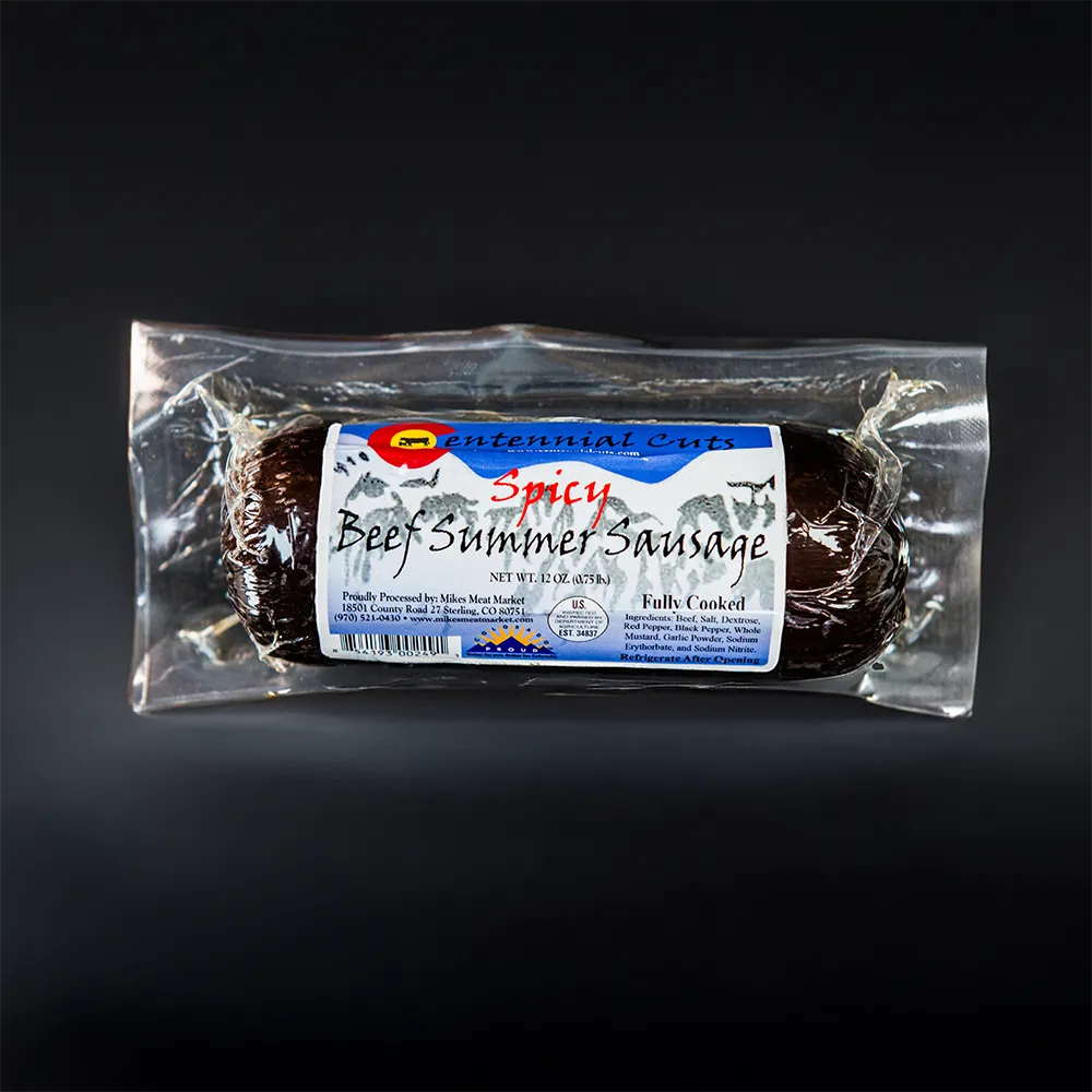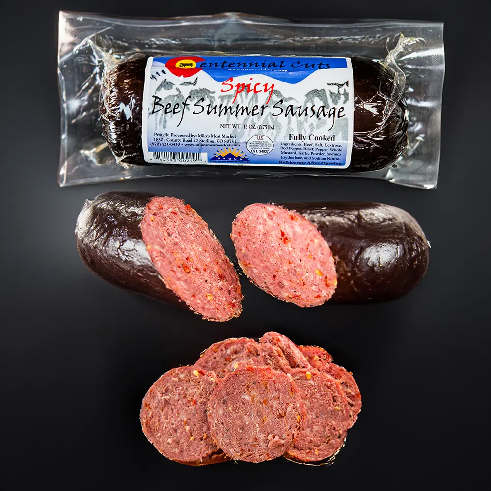 Spicy Summer Sausage is a fan favorite! Flavored with red pepper flakes, this item has a medium spice level and a great taste! Slice it up and pair it with some cheese and crackers, or enjoy it alone. All our fully cooked summer sausage and beef sticks are made at Mike’s Meat Market in Colorado. All our beef is sustainably raised and harvested in Colorado.