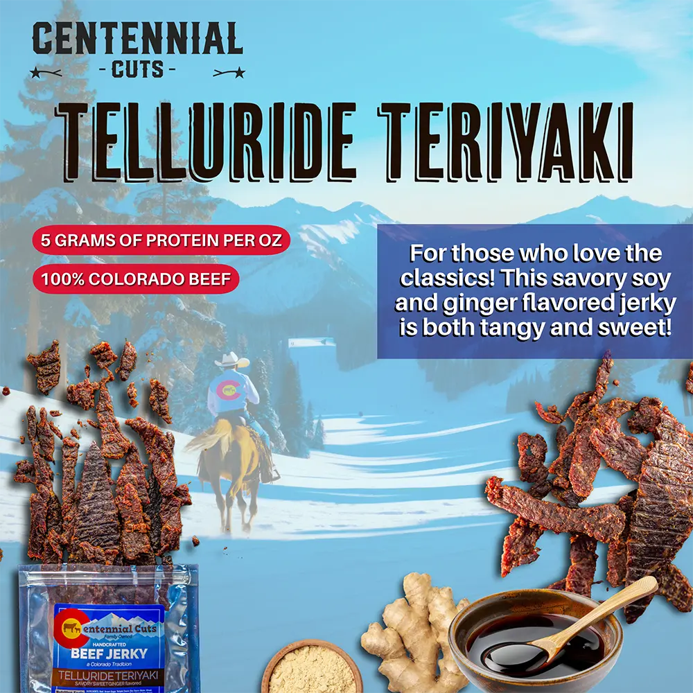 For those who love the classics! Telluride Teriyaki is super sweet! This savory soy and ginger flavored jerky is both tangy and sweet! Our jerky is the perfect protein-packed snack! All our beef is sustainably raised and harvested in Colorado.